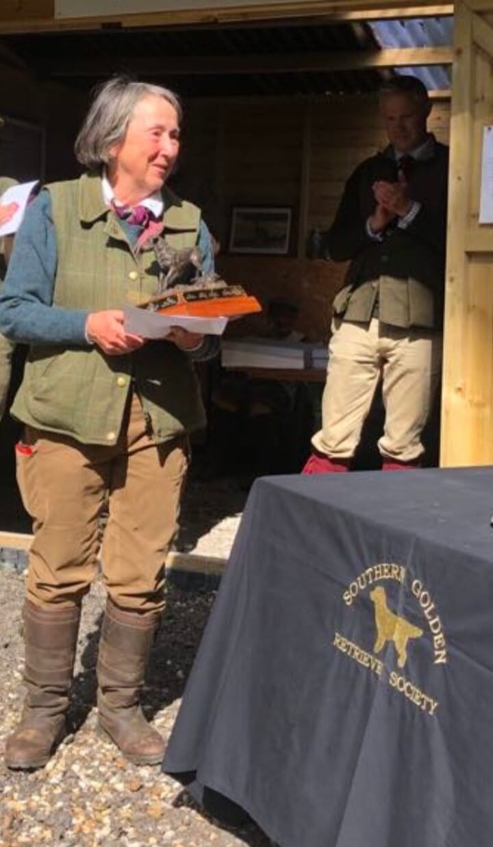 1st Place and the SGRS Perpetual Trophy for the Winner, The Camrose Evenpatrol Trophy for the Best Golden Retriever and the Sandicliffe Trophy for Guns Choice all went to Jinkster Goldencrest (GR dog) owned and handled by Mary Hogg.
